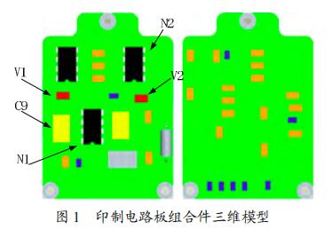 印制電路板組合件由印制電路板和多個(gè)元器件組成。每個(gè)元器件的質(zhì)量、外形尺寸都可以通過(guò)實(shí)際測(cè)量獲得。運(yùn)用ANSYSWorkbench軟件,按照印制電路板組合件的真實(shí)狀態(tài)建立了印制電路板組合件的三維模型,如圖1所示,標(biāo)注位置為沖擊試驗(yàn)失效器件。