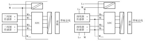 壓力變送器中的模擬量輸入為二線制和四線制儀表,接線方式如圖3所示。二線制是相對于四線制(兩根供電線路、兩根通信線路)來說的,將供電線纜與信號線纜合二為一,兩根線纜實現(xiàn)通信兼供電功能。從標準意義來說,對于二線制儀表,AI模塊能接收到4~20mA的電流信號,如果線路斷路則AI模塊接收到的電流為0mA,如果線路短路則AI模塊接收到的電流大于20mA;對于四線制儀表,無論信號斷路還是短路,AI模塊接收到的電流均為0mA。