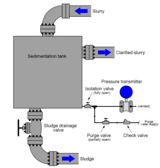 隔離壓力儀器與過程流體直接接觸的另一種方法,尤其是當脈沖管線易于堵塞時,是用連續(xù)的清潔流體流沖洗管線。考慮以下示例,其中在沉淀容器底部測量壓力: