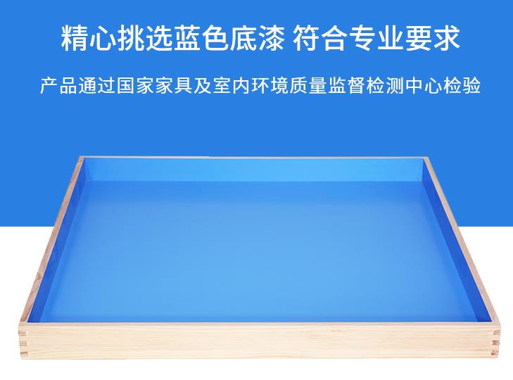 ?、贅?biāo)準(zhǔn)沙箱2個:內(nèi)側(cè)尺寸為720×570×70mm,邊厚25mm,實木噴漆,外側(cè)涂木本色,內(nèi)側(cè)涂天藍(lán)色,防水。箱體帶有基座,沙箱嵌扣在一個同材質(zhì)的框式固定架上,具有較好的穩(wěn)定性,固定架帶有4個萬向輪(其中2個帶有剎車功能),便于活動中沙箱的移動和搬運。