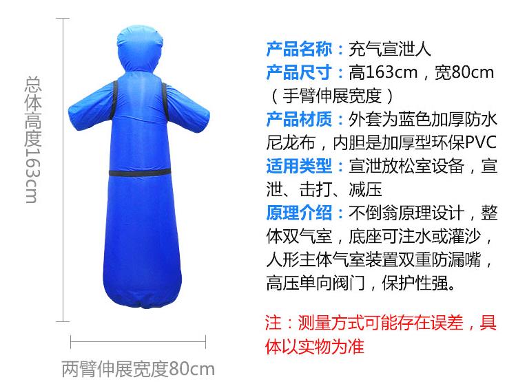 2、環(huán)保材質:充氣宣泄人內膽為0.5mm加厚型環(huán)保PVC,外為藍色加厚防水尼龍布