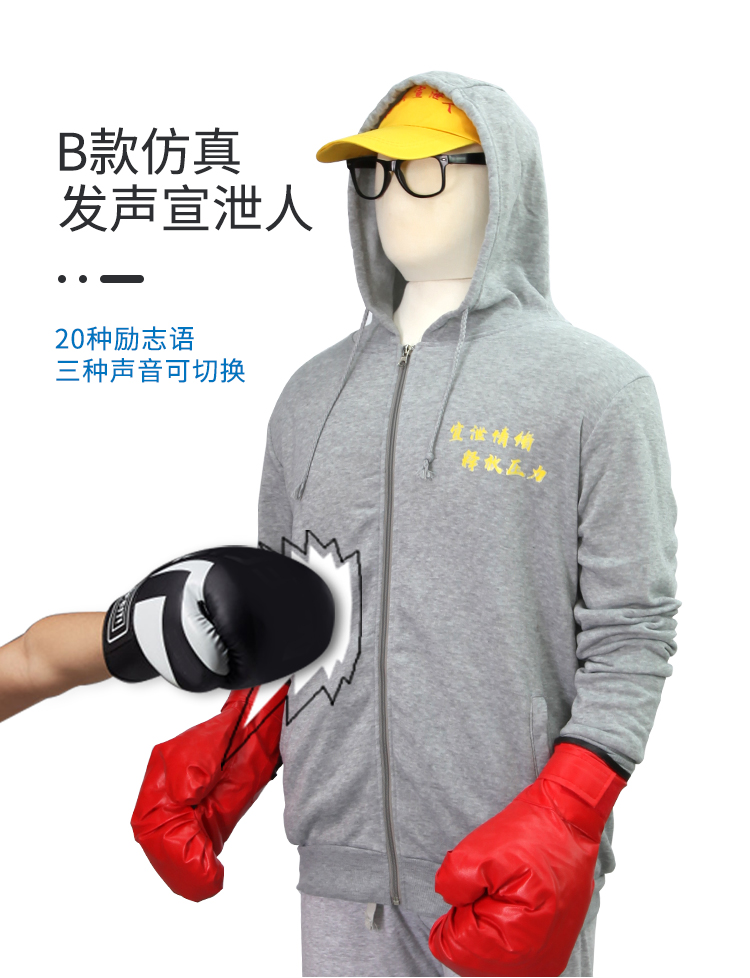 發(fā)聲宣泄人是仿真宣泄人其中一種,是市場(chǎng)上為數(shù)不多的可擊打發(fā)聲版宣泄人,利用低電壓震動(dòng)系統(tǒng),能夠在極低的震動(dòng)下做出響應(yīng),來(lái)訪者在擊打的時(shí)候可以隨機(jī)發(fā)出十一中不同的幽默語(yǔ)句,例如:別打臉,打屁股;都是我的錯(cuò),讓你愛上我,使得趣味性提高,來(lái)訪者在進(jìn)行體力宣泄的時(shí)候開懷大笑。轉(zhuǎn)移來(lái)訪者的注意力,將心中不悅的情緒最大程度釋放。并且擁有錄音功能,用戶能夠自由定制宣泄人的擊打語(yǔ)句。